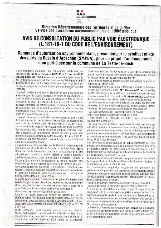 Une permanence sera assurée par la commissaire enquêtrice le mardi 9 décembre entre 14 h et 17 h à la mairie testerine qui organisera également deux réunions à la cabane du » Piou » sur le port de La Teste de Buch, avenue Ovide Rousset, le mercredi 5 novembre 2025 et le mercredi 14 janvier 2026 de 18 h à 20 H.