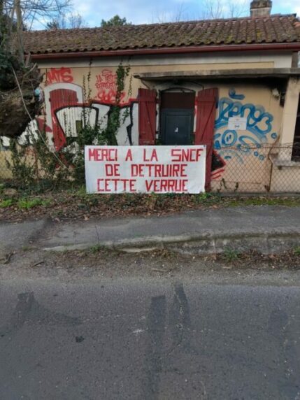 En ce sens, une banderole a été fixée sur la barrière de cette bâtisse avec le libellé suivant: « Merci à la SNCF de détruire cette verrue) Par contre, pendant les dernières fêtes du 1er de l’an, un futur nostalgique de cette ruine a du être dérangé par cette action car la banderole a été lacérée mais rapidement remplacée, voir les pièces-jointes.