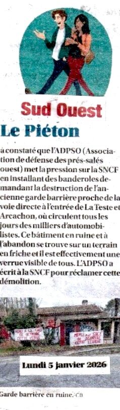 L’ADPSO a eu les honneurs ce matin 5 janvier dans le « Piéton » de Sud Ouest (voir les pièces-jointes) qui concerne un des objectifs de notre association à savoir, la déconstruction de la garde barrière du chemin de Mariolan desservant les quartiers arcachonnais et testerin de la Règue Verte, Arcachon Marine et l’Aiguillon, située à quelques dizaines de mètres de la voie directe Bordeaux / Arcachon ou circulent journellement des milliers de véhicules .