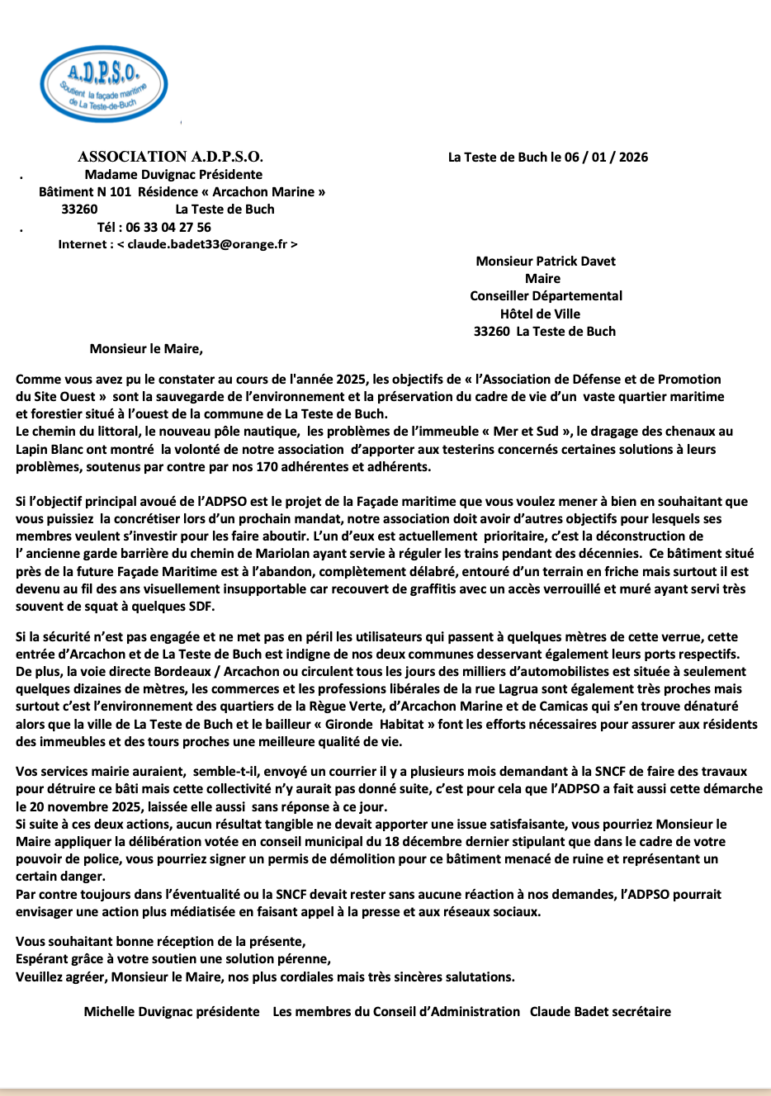 Egalement et pour information un courrier a été envoyé le 20 novembre dernier à la SNCF sans réponse à ce jour, voir toujours les pièces-jointes, mais si cela persiste il faudra se rapprocher de Monsieur le Maire de La Teste de Buch en lui indiquant que dans le cadre de son pouvoir de police, il pourrait signer un permis de démolition pour ce bâtiment devenu dangereux et qui impacte le cadre de vie des riverains testerins très proches.