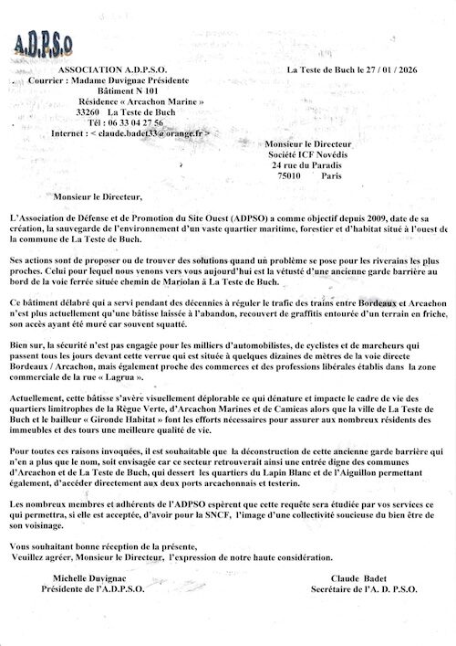 Suite à notre objectif et à notre action afin que la garde barrière du chemin de Mariolan disparaisse du quartier Règue Verte, Camicas, Arcachon Marine, Monsieur le Maire de La Teste de Buch vient de nous avertir qu’un courrier en ce sens a été envoyé à la SNCF pour demander à cette collectivité de déconstruire cette bâtisse.